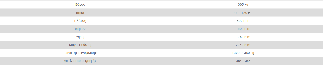 - Υδραυλική ανύψωση με μπουκάλα διπλής ενεργείας και περιστροφή 36° και 36° στο μοντέλο BP1300S.