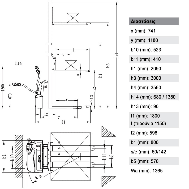 - Συνολικό ύψος περονοφόρου 3560mm με ανεβασμένα πιρούνια (h4)
