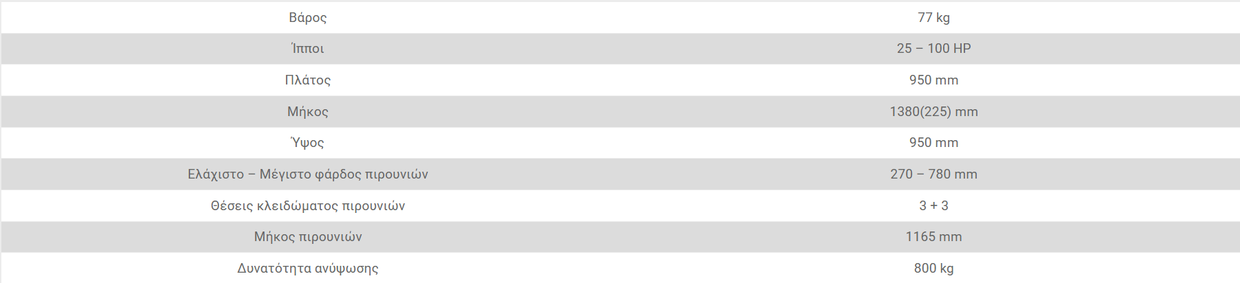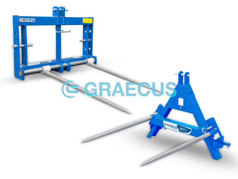 - Πιρούνια για μπάλες φορτίου 800kg με ρύθμιση θέσης, αναδυπλούμενα, μήκος λόγχης 1165mm για ζευξη στο υδραυλικό σύστημα 3ων σημείων του τρακτέρ