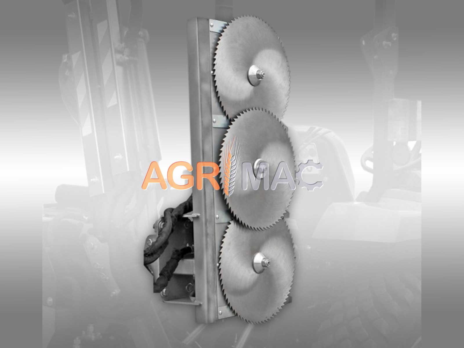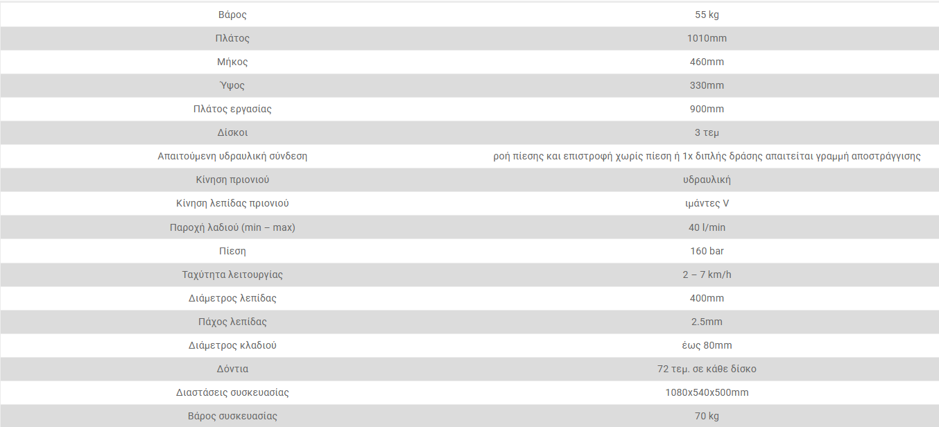 Διαθέτει 3 πριονόλαμες (72 δόντια η καθεμία) και διάμετρο 400 mm. Το πριόνι έχει αποτελεσματικό πλάτος εργασίας περίπου 900mm. Οι 3 λεπίδες πριονιού με μύτη, καρβιδίου κινούνται υδραυλικά. Απαιτείται παροχή υδραυλικού λαδιού τουλάχιστον 40 l/min.