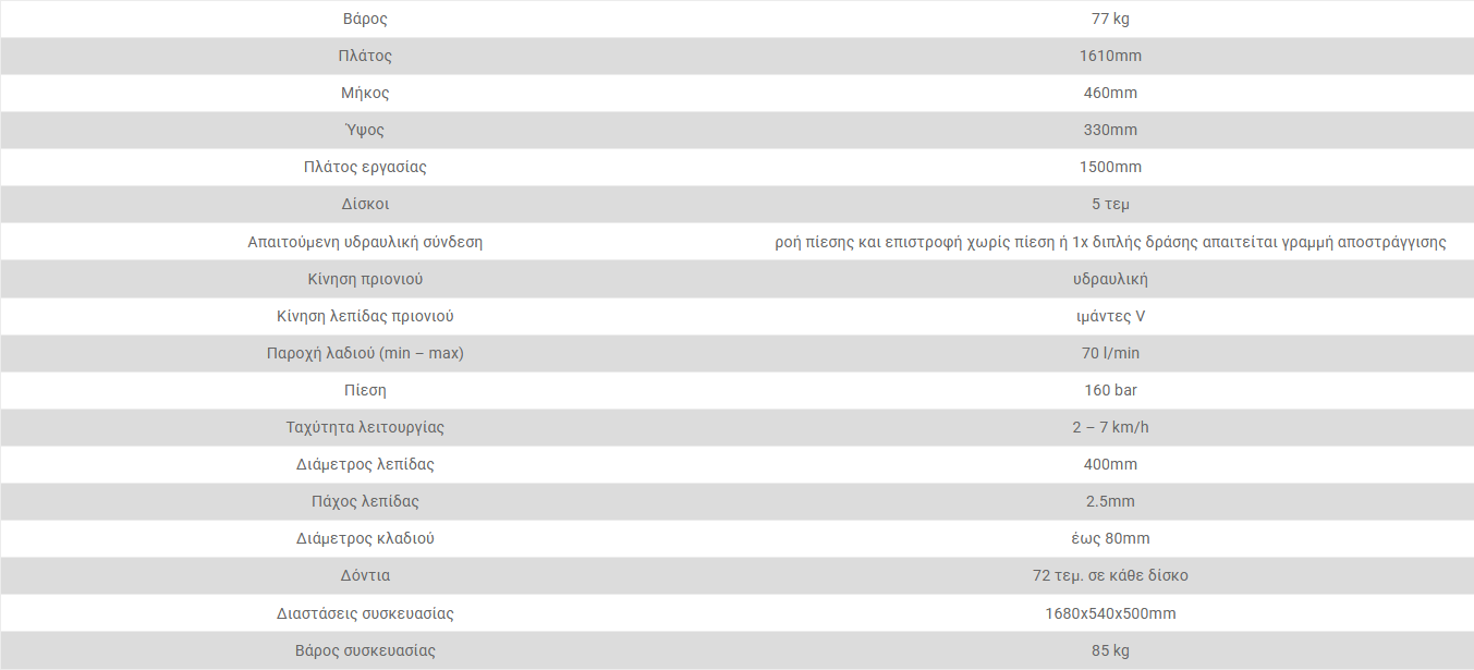 Διαθέτει 5 πριονόλαμες (72 δόντια η καθεμία) και διάμετρο 400 mm. Το πριόνι έχει αποτελεσματικό πλάτος εργασίας περίπου 1500mm. Οι 5 λεπίδες πριονιού με μύτη, καρβιδίου κινούνται υδραυλικά. Απαιτείται παροχή υδραυλικού λαδιού τουλάχιστον 70 l/min.