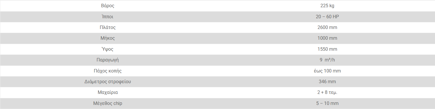 - Το τύμπανο είναι εφοδιασμένο με 2 υψηλής σκλήρυνσης μαχαίρια και 2 σειρές τεσσάρων σφυριών συνδυάζοντας τη χρήση 2 μηχανημάτων κλαδοτεμαχιστή – βιοθρυμματιστή.