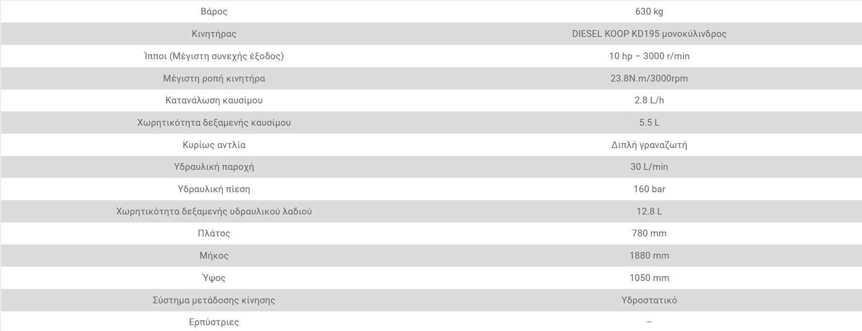 - Μονοκύλινδρος πετρελαιοκινητήρας Koop KD192 10hp – 3000r/min, νέας γενιάς STAGE V με χαμηλότερη κατανάλωση.