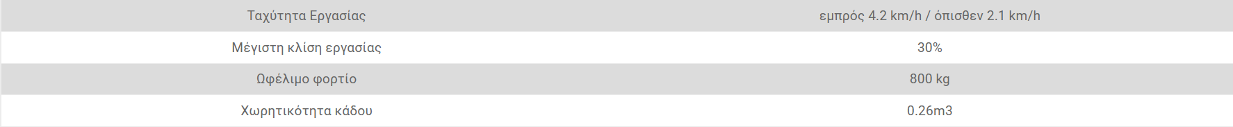 - Οι ερπύστριες επιτρέπουν τη χρήση του σε έως και 30% κλίση. Η ικανότητα φόρτωσης και μεταφοράς είναι 800kg.