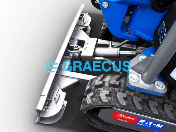 Το πλάτος της λεπίδας ισοπέδωσης μπορεί να προσαρμοστεί εύκολα και γρηγορα με έναν πείρο ώστε να ταιριάζει με το πλάτος των πτυσσόμενων ερπυστριών. |
