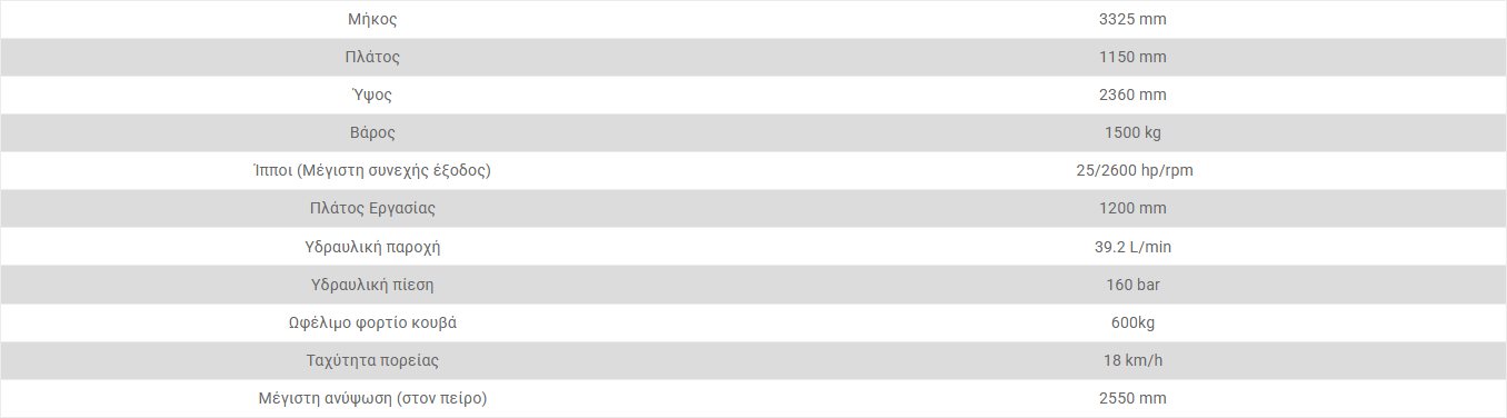 χρησιμοποιηθεί για κάθε είδους ασυνήθιστες εργασίες. - Το μεταξόνιο, το περιορισμένο εξωτερικό πλάτος 1,15m και το αρθρωτό πλαίσιο, το καθιστούν πολύ ευέλικτο ακόμη και