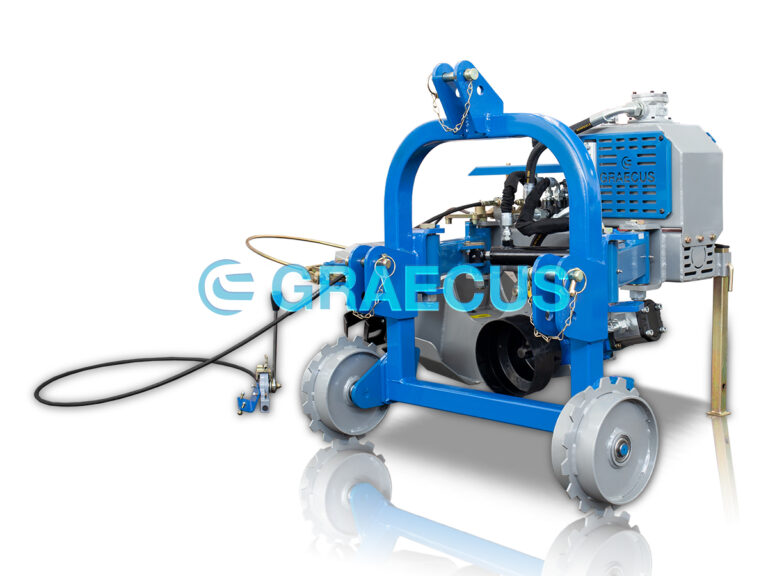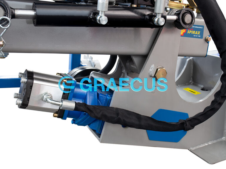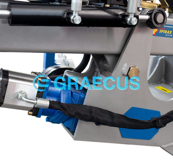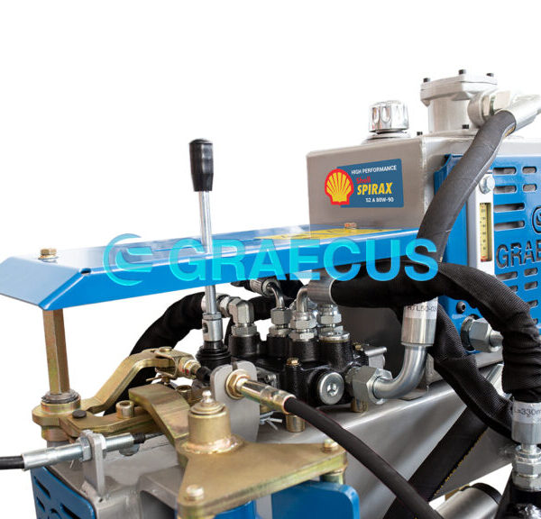 - Η κλίση της κεφαλής ρυθμίζεται υδραυλικά με μοχλό. Άλλος ένα έξτρα απομακρυσμένος μοχλός στη θέση του χειριστή ενεργοποιεί την μετατόπηση για την αποφυγή εμποδίων.